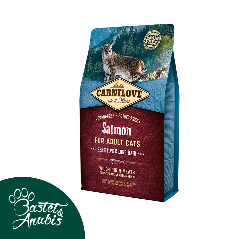 Carnilove Salmon for Adult Cats 2kg is a premium, grain-free, and potato-free dry cat food formulated to meet the nutritional needs of adult cats, particularly those with sensitive digestion or long haired breeds. This complete cat food emphasizes high quality salmon protein, which is non-allergenic and rich in omega-3 fatty acids, promoting healthy skin and a shiny coat.